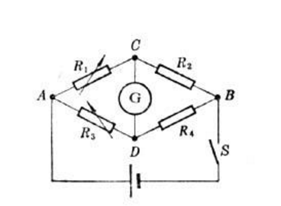 电桥概念:用比较法测量各种量(如电阻、电容、电感等)的仪器。最简单的是由四个支路组成的电路。各支路称为电桥的“臂”。如图1电路中有一电阻为未知(R2),一对角线中接入直流电源U,另一对角线接入检流计G。可以通过调节各已知电阻的值使G中无电流通过,则电桥平衡,未知电阻R2=R1·R4/R3。