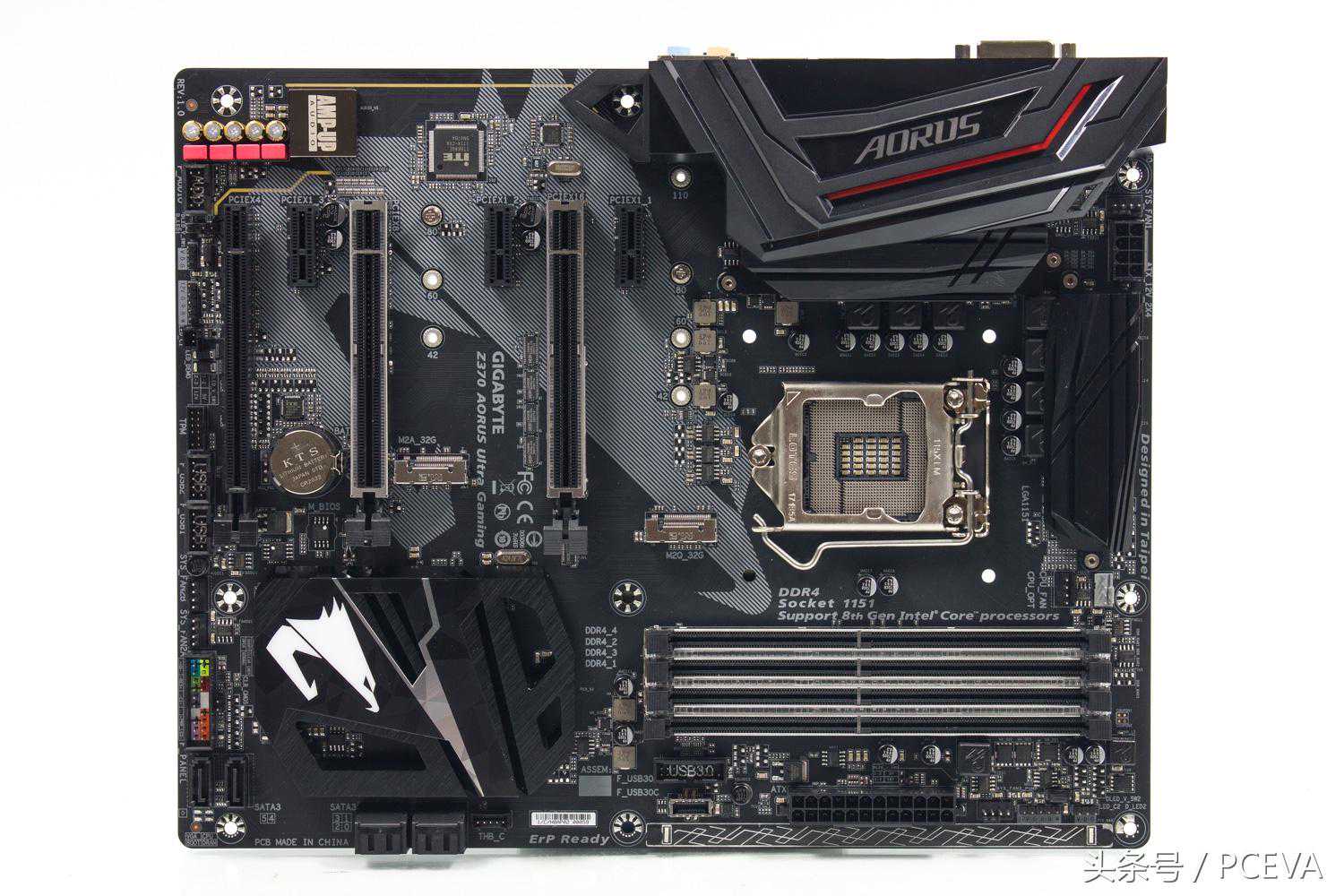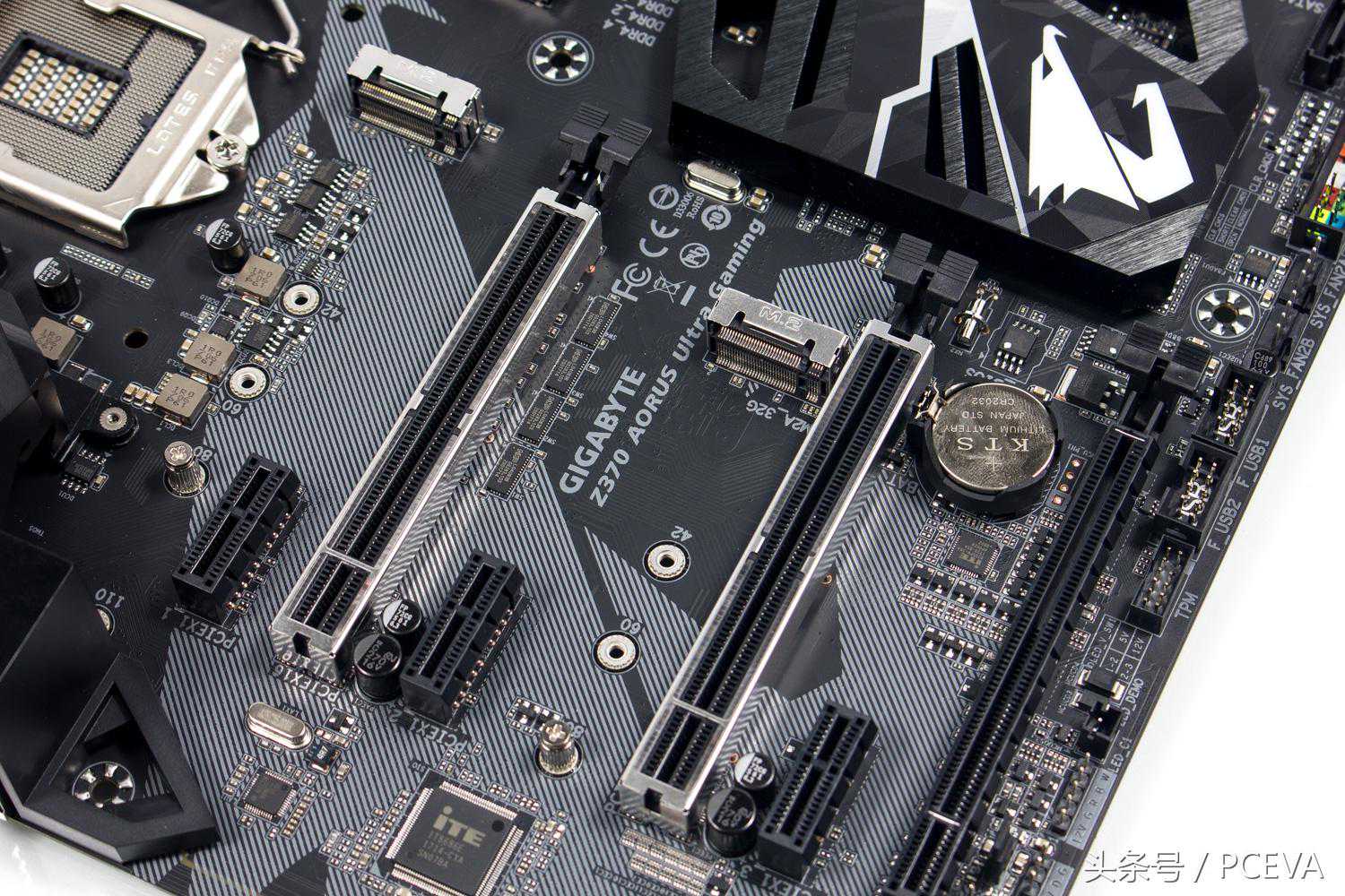 技嘉Z370AORUSUltraGaming主板配色和之前技嘉的Z270主板没有太大改变,还是黑色调为主,在内存插槽、CPU供电、PCIE插槽部位加上RGB灯光,主板PCB上还印了一个巨大的雕牌LOGO。
