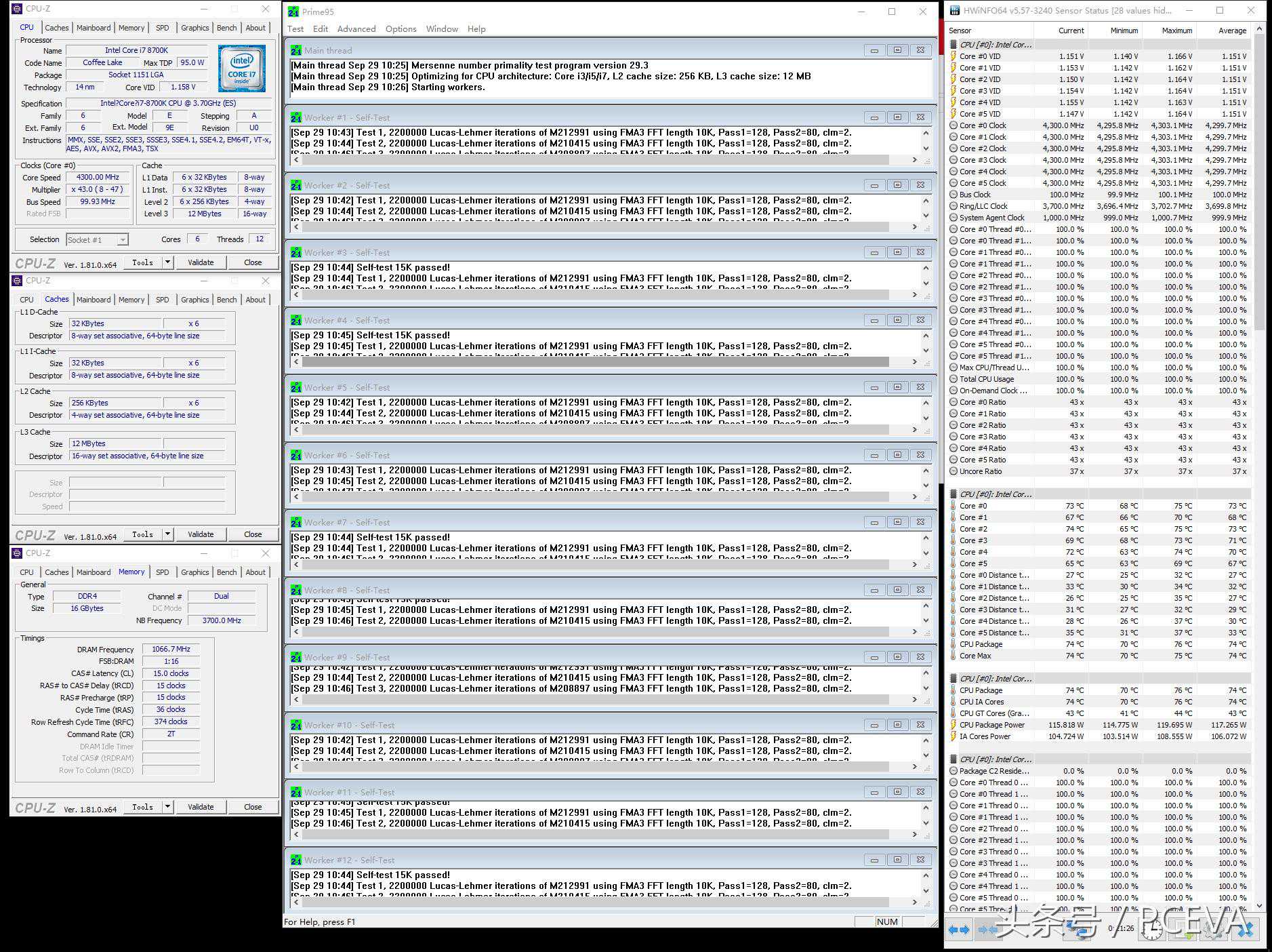 首先看默认频率的对比,Corei58600K单核睿频比7600K高0.1G,所以SuperPi、CineBench单线程等测试比7600K稍微快一点点;在多线程测试中,8600K跑在4.1G,比7700K低0.3G,但是6个物理核心在部分项目上还是能跑赢Corei77700K的8个线程。