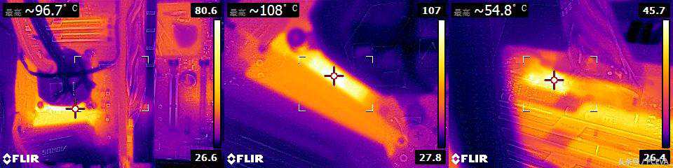 此时主板供电最大输入功率增加至196.8W,CPU供电温度也升高至108度,4相供电能负载近200W已经是很不错了,温度高一些也不奇怪。