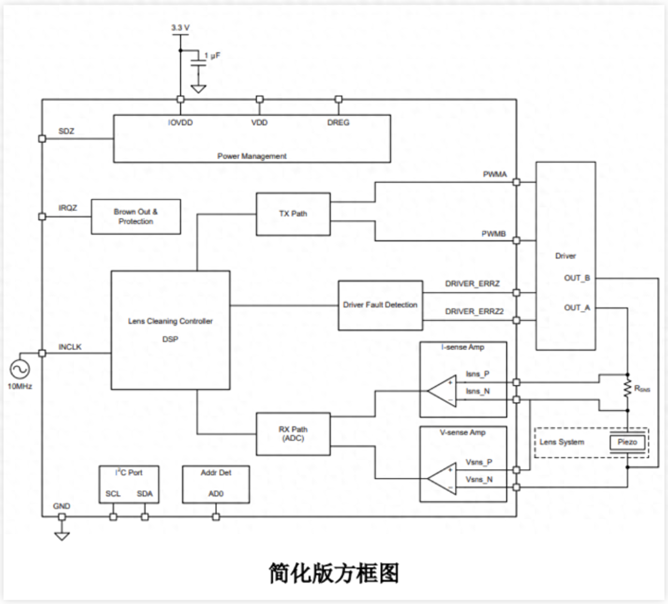 今年看到有两个比较有意思的产品,一个是用于超声波镜头清洗的可配置DSPULC1001,具有电流和电压检测及PWM输出,专用于基于压电效应的镜头清洗系统。ULC1001和DRV29xx共同创建超声波镜头清洗系统。