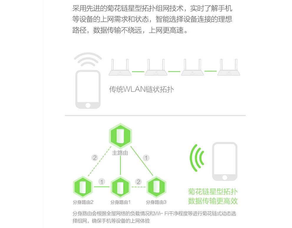 与传统的WIFI桥接相比,MESH组网变化更灵活,漫游效率更高,哪怕分身路由器有断电,也不影响其它分身继续使用:
