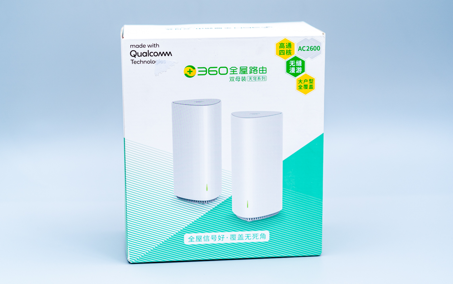 1、360全屋路由双母装天穹系列,外包装白绿配色,很靓眼: