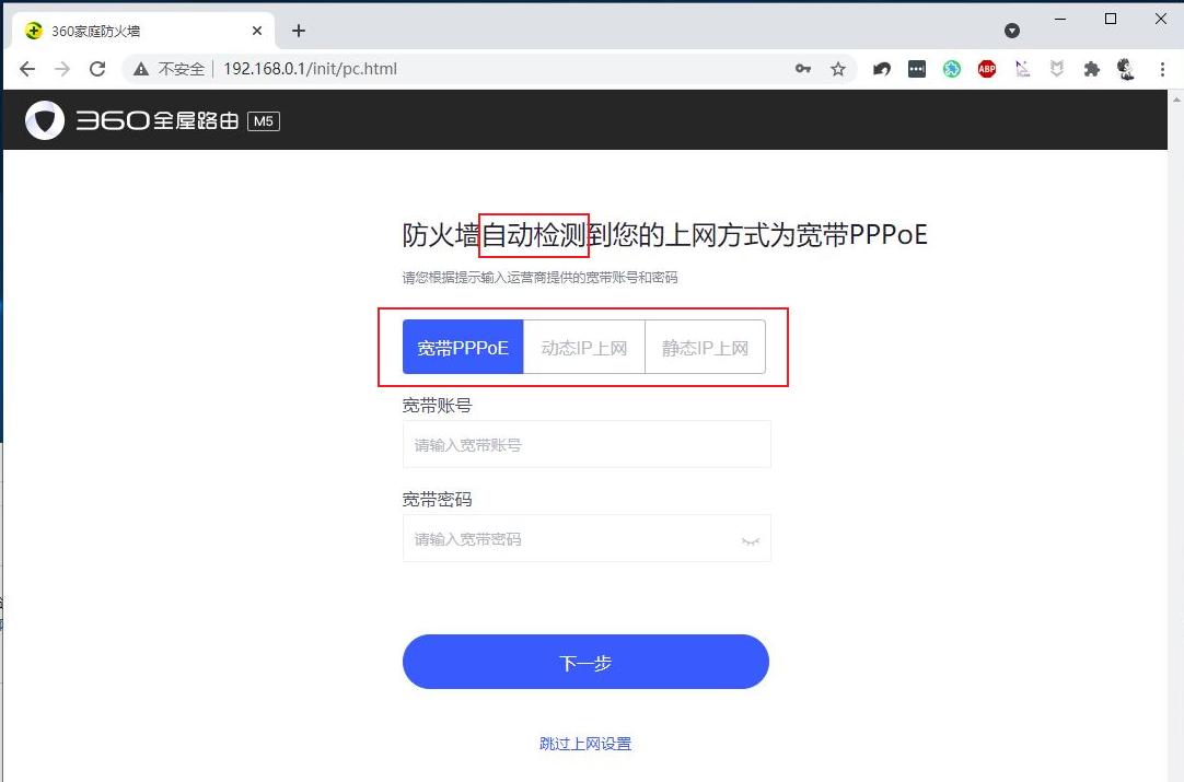 9、然后360全屋路由的系统,会自动检测到家里的上网方式: