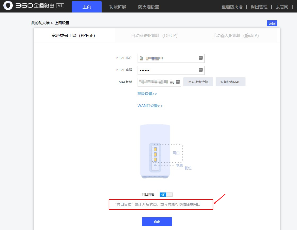 15、在上网设置中,可以看到网口盲插的选项,我们的宽带网线,可以插任意网口,很方便: