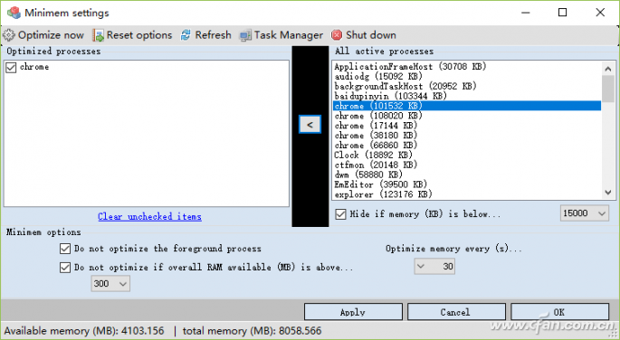 其实利用“Minimem”这款小工具,就可以有针对性的对软件内存进行优化。首先从官方网站下载适合于自己系统版本的安装程序,安装完成以后它就会静静的显示到系统托盘的区域,我们双击系统托盘中的工具图标就可以看到它的操作界面了。在窗口右侧的列表中可以看到目前正在运行的程序,在列表的下面有一个名为“Hideifmemory”的选项。用户可以在后面设置一个内存占用的数值,这样只有超过了这个设定数值的软件进程才会显示到列表里面。