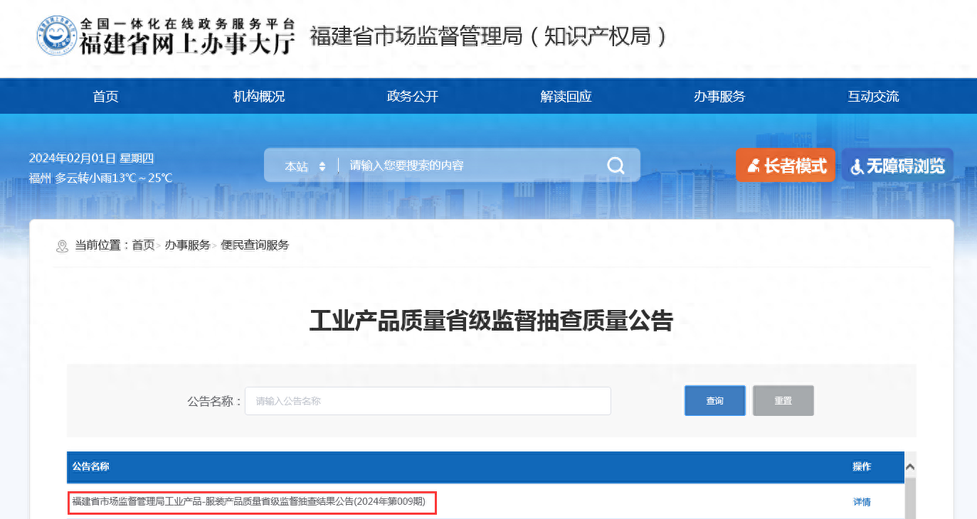 福建省市场监督管理局工业产品-服装产品质量省级监督抽查结果公告(2024年第009期)