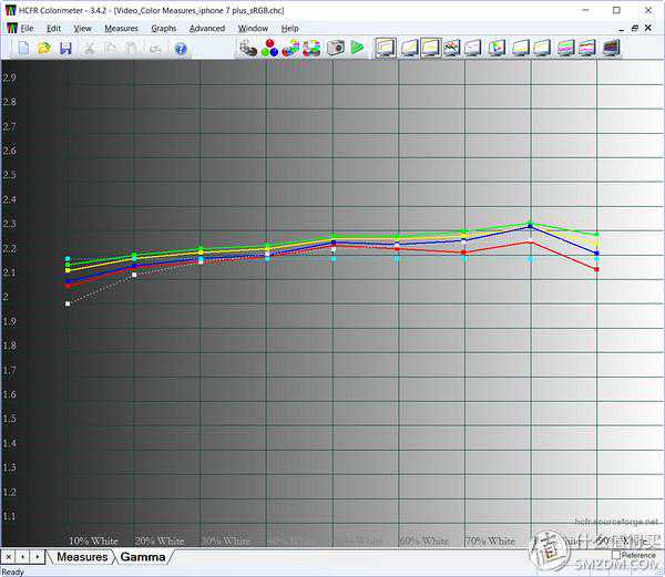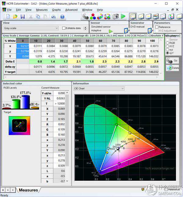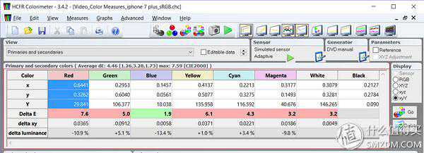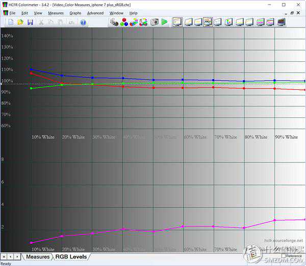 -RGBLevels基于D65标准,平均色彩偏移Δ,最大值为7.59,算是比较好的结果。红色略微有一些差距(Δ),特别是在IRE50以上的明亮部分。相对来讲蓝色的偏移值算是比较低了,只有1.9。