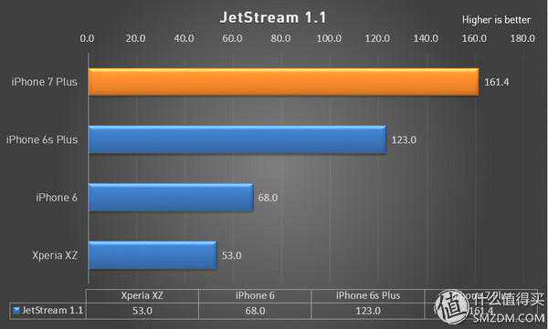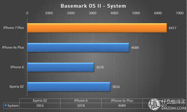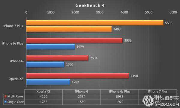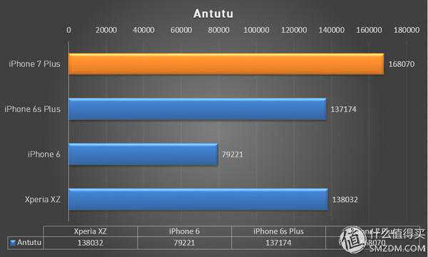 结果与GeekBench相似,iPhone7Plus整体分数较6sPlus提升20%,XperiaX略高于6则垫底,只相当于iPhone7Plus的50%。