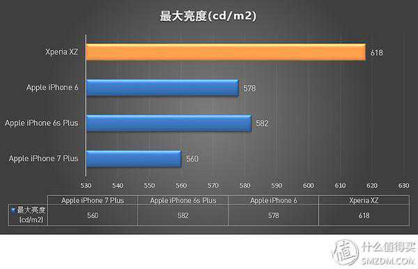 XperiaXZ的最大亮度达到了618,这样的高亮度在阳光下显示也不会成为困扰。iPhone7Plus也达到了560,加上抗反光涂层,阳光下的效果也不会差。官方宣称的25%屏幕亮度提升,测试中没有体现出来,也许在强光照射或是RetinaFlash的时候会激活吧~~