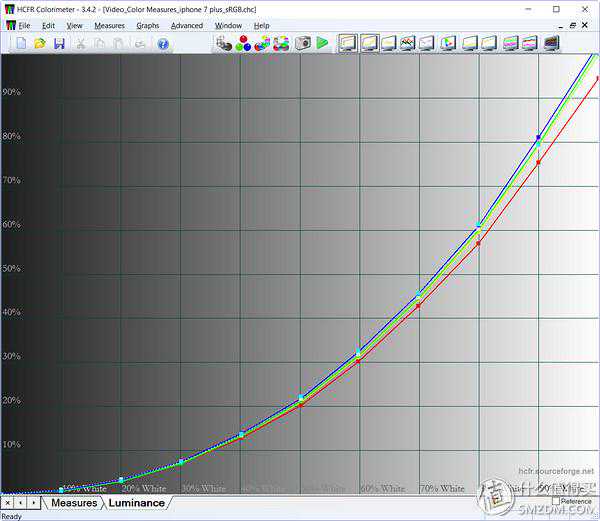 -Luminance光亮度灰阶全黑(IRE0)至全白(IRE100),红绿蓝三种色彩没有完全充电,特别是从IRE80开始,偏差逐渐变大。在显示比较明亮的画面时,蓝色会有欠缺,红色会加重,绿色比较接近平均值。