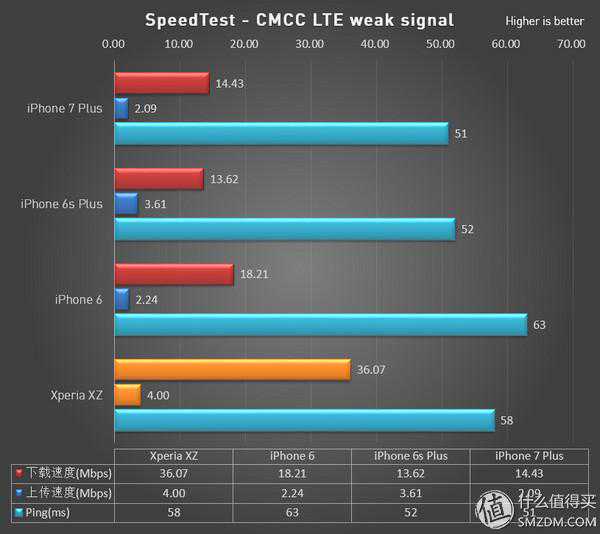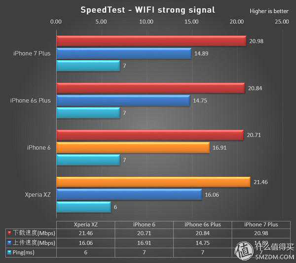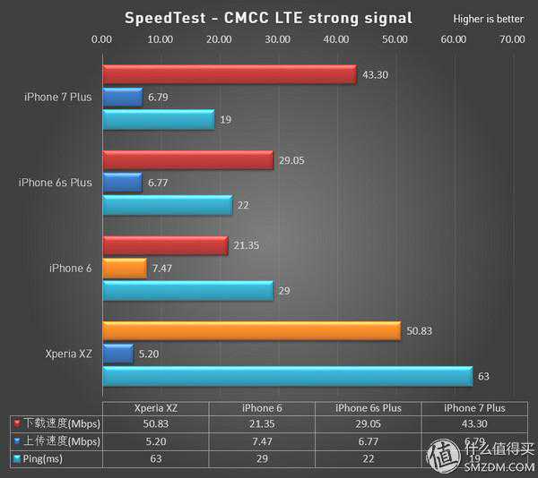 在强信号下,XperiaXZ下载速度依然保持大幅领先,达到50.83Mbps,超过iPhone7Plus的43.30Mbps25%。上传速度则相对比较接近。