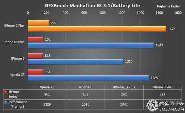 结果可以看出iPhone7Plus在保证相当性能的情况下,提供比6s+更多的续航时间。性能得益于A10GPU的提升,续航则是容量更大的电池。