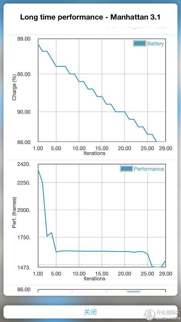 从下面的Frames,可以看到iPhone7plus初始性能很高之后降低了约30%的性能,持续到最后。